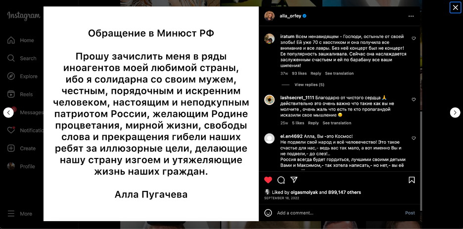 I ask to be counted among the ranks of foreign agents of my beloved country, for I am in solidarity with my husband, an honest, upright, and sincere person, a true and incorruptible patriot of Russia who wishes his Motherland a flourishing, peaceful existence, freedom of speech, and an end to the killing of our boys for an illusory goal that has made our country a pariah and has made life more difficult for our citizens.