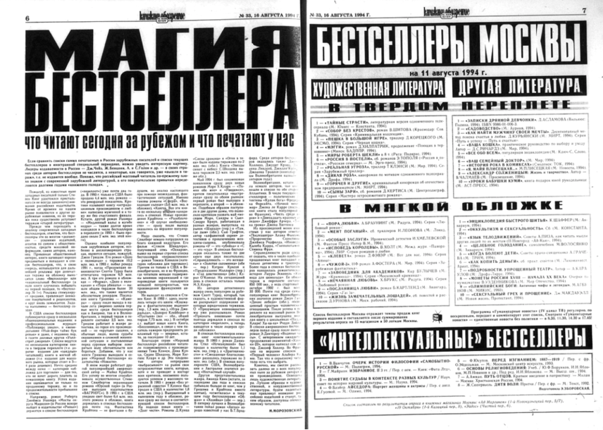 “Bestsellery Moskvy,” Knizhnoe obozrenie, no. 33 (16 Aug 1994): 6–7.