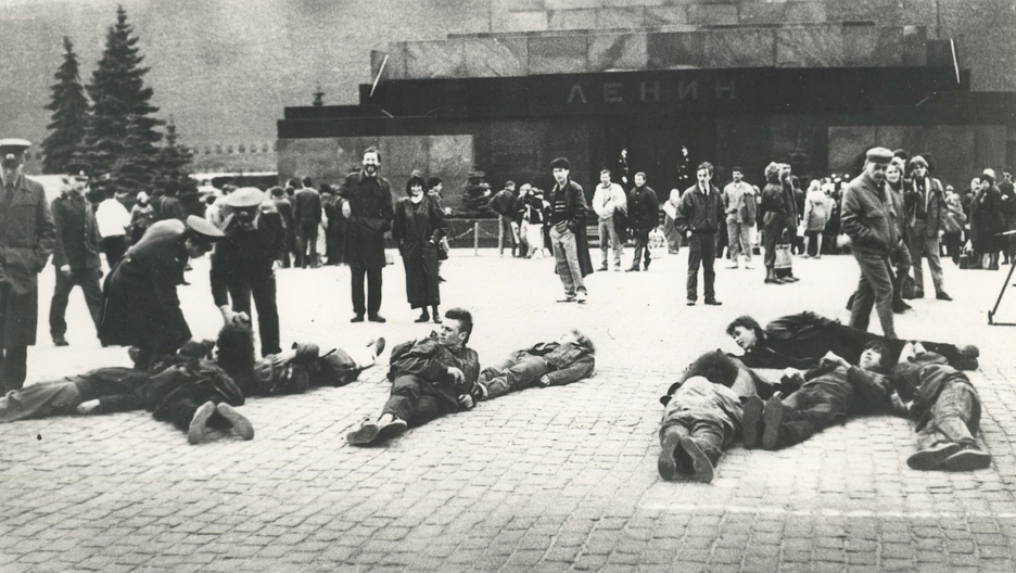 Actionist artist and theorist Anatoly Osmolovsky and Dmitri Pimonov, who in the late 1980s formed the art actionism group “E.T.A” for “Expropriation of the Territory of Art” (Э.Т.И.) with Georgii Gusarov, organized a festival of French film using it to stage several provocative performances. Perhaps the most famous took place after the showing of Louis Malle’s Zazie dans le Métro (1960) when the two artists appeared on stage, initially reenacting scenes from the film and eventually proceeding to throw cakes at each other. The newly formed group built on these successes becoming a fixture within the 1990s actionist scene in Moscow. “E.T.A.” actions included attempting to sell a refrigerated bust of Lenin on the Red Square (1990), consuming salami and bread with political slogans on the Red Square, Price 2.20 (1991), and probably their most notorious work E.T.A.--text (1991) when they spelled out a profane word for the male genitals on the Red Square with their own bodies (fourteen artists were involved), protesting the recently-passed April 15th, 1991 law prohibiting profanity in public places. E.T.A.s actions defiantly and definitively appropriated the Red Square as a major site for performance art challenging or provoking the state’s authority over public spaces. The group dissolved in 1992.