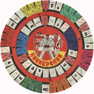 Kommersant functions as a variant of Monopoly, with players investing in property, developing businesses, and drawing cards with boni and penalties. Unlike most games in the legacy of Lizzie Magie’s Landlord’s Game, Kommersant splits its circular track into two concentric rings, with the inner ring representing a secondary and more significant economy for investments, specifically “Theaters” and “[Distribution] Bases”, representing control over the culture industry and centralized distribution, both hallmarks of the Soviet planned economy, that must be reached in-game. The inner economy doesn’t saddle players with “fines” (the relevant space is simply absent in the inner circle) and suggests identically vast, but more authoritative domains than those available on the outer circle.