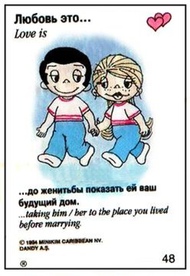 "LoveIs" gum insert. Image shows a man and woman walking somewhere. The English text reads: "taking him/her to the place you lived before marrying". The Russian text reads: "Showing her your future marriage house". LoveIs featured Kim Casali's syndicated cartoon "Love Is", however the explosion in similarly adorned gum included everything from film stills from the Godfather and Jurassic Park to pornography.