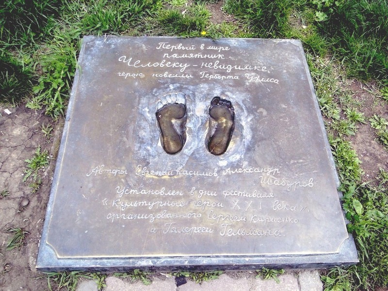 Shaburov's monument to an invisible man was made in collaboration with the writer Evgenii Kasimov in honor of H.G. Wells' canonical character. The project was funded by Marat Guelman, with Kasimov contributing the left foot imprint and Shaburov responsible for the labor of creating the sculpture and the right foot imprint. Although Shaburov is perhaps the only well-known artist to create such a monument, sculptures dedicated to fictional characters, and the invisible man specifically, proliferated in the 1990s as a widespead ironic game with the legacy of Soviet monuments, which by-and-large disappeared during the 1990s, removed, dismantled or rarely displaced to museums. The heroic Soviet statue disappeared but its absence is marked by statues such as the "Monument to an Invisible Man", which both lament and mock the void left behind.