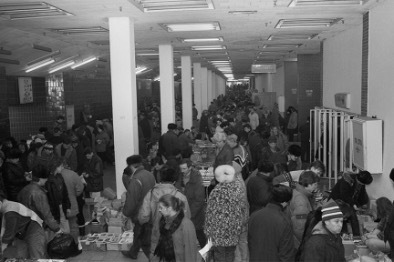 Olympic Stadium (Olimpiiskii sportivnyi kompleks), built for the 1980 Olympic Games, is located northeast of the center near the Prospekt Mira metro station. When built, it was the largest covered sports arena in Europe, holding that title until 2017. In December 1987, it hosted the first western rock band to play in the Soviet Union, Uriah Heep, and went on to host concerts from Pink Floyd and Black Sabbath before 1991. But the stadium complex played its most important role in the post-Soviet public sphere only later, and not for the events it hosted inside, but for the market that burgeoned in its outer corridors. In the wake of the January 1992 Presidential decree on free trade (ukaz o svobodnoi torgovle), many public spaces quickly turned into makeshift marketplaces, attracting merchants and buyers of everything from homegrown produce to cigarettes and imported clothing. One of the first markets in Moscow, Izmailovo, soon became too small for a booming business—the book trade—and in 1993, a group of publishers got together an rented the spacious outer corridors of Olympic stadium for the booming trade in the printed word.