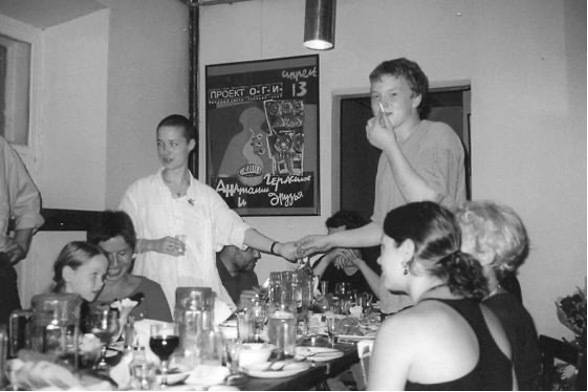 The United Humanities Press, or Ob”edinennoe gumanitarnoe izdatel’stvo, known as OGI, published more than 50 collections of poetry along with several works in the humanities by serious scholars, but the name is associated more than anything with Project OGI, a legendary club started in 1998 by Dmitry Itskovich, Nikolai Okhotin, Mikhail Riabchikov and a handful of important and influential poets, writers, and critics. The food was bad, the service was worse, but the atmosphere couldn’t be beat. As one regular put it, the club had already existed around everyone’s kitchen tables for a long time. It had just never had a place of its own. It was no surprise that Project OGI’s first location—the first place where that intellectual public gathered—was in a remodeled apartment on Trekhprudnyi lane. Though the club had to move locations it quickly became a center of Moscow intellectual and artistic life. Regular poetry readings, book launches, and concerts punctuated the atmosphere of intellectual inebriation that flowed freely from the bar into the adjoining bookstore and back.