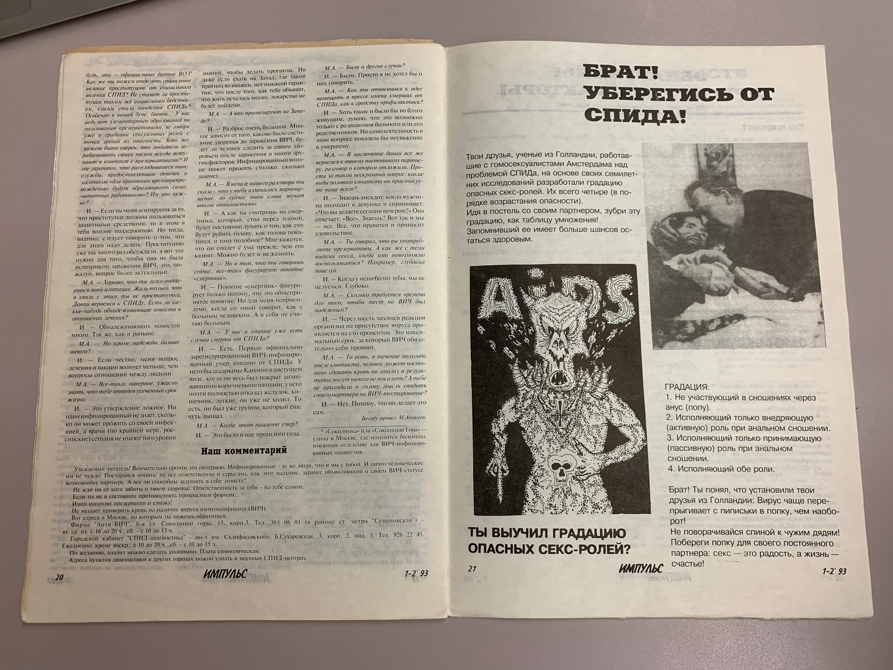 Article 121 of the Russian Federation Criminal Code — the law criminalizing sexual relations between men — was repealed the same year this issue of Impulse was published, meaning that up to the moment of the issue’s publication, any man who contracted HIV/AIDS through sexual contact with another man was a criminal. In the 1980s high-ranking officials made public statements to the effect that Soviet Society at-large was impervious to the AIDS epidemic thanks to the criminalization of sexual relations between men (see “AIDS: More Questions than Answers”). As also happened in some segments of Western society, in Russia AIDS was often represented as a plague cleansing the population of human dross, a kind of evolutionary agent vindicating the decidedly negative value ascribed to gay men as a human category. In the United States the Clinton administration brought a good deal more attention to, and investment in combatting, the AIDS epidemic, following the Reagan administration’s policy, pursued to appease its conservative religious base, of treating the disease as a minor concern only affecting marginal elements of American society. In Russia this attitude continued into the 1990s. As prospective victims of the disease, gay men in Russia at this time were faced with a situation where the state was not only not willing to devote substantial resources to research and treatment, but was also not willing to invest in far less resource-intensive profilactic measures, including information and education, which is why Impulse readers are encouraged here to rely on their “friends” — Dutch researchers working with the gay population of Amsterdam. Unlike their Dutch counterparts, these readers, if not careful to avoid infection, were faced with the prospect of infection, illness, and painful death from this devastating disease in a country disinterested in their health, wellbeing, even their survival, a country disinclined to invest resources in prevention, research, treatment, or palliative care. The graphic aspects of the page are interesting: a cartoon of the disease imagined as a monster, and a photograph of an emaciated dying AIDS patient being comforted by a loved one. The somewhat jarring juxtaposition of the iconographic, allegorical cartoon image of the disease and the indexicality of the wrenching photograph recording the suffering and demise of a singular, concrete person being destroyed by the disease is echoed in the disjunct between tone and subject matter in the textual component. In an announcement dealing with matters of disease and excruciating death, puerile phrases and formulations are used presumably for jocular effect: “the virus jumps from the pee-pee into the tushy more often than the other way around!”
