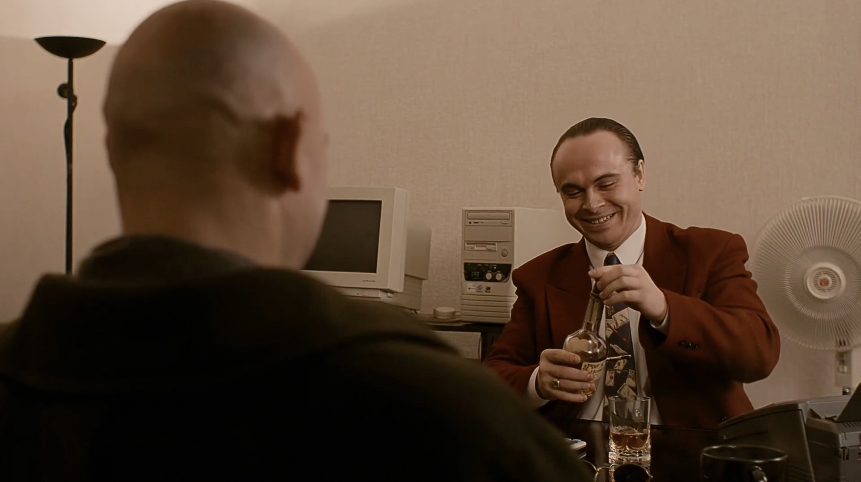 The problem was that the term “New Russians” never stuck to the kind of people that were celebrated by either Chto? Gde? Kogda? or Kommersant. Rather, it described white-collar criminal businessmen (at best), or outright racketeers (at worst). For both, the raspberry blazer became common attire, and its prominence was more likely the result of efforts by Gianni Versace and Sergei Mavrodi. On the first count, raspberry blazers were present in the Versace Men’s collection in 1991 and 1992. Given Versace’s self-evident primacy for those interested in conspicuous consumption, it is not at all a surprise that his suits– and many more knockoffs– entered the Russian market at the time. On the second count,, it has often been said that the popularity of the raspberry blazer was sealed by Sergei Mavrodi, the founder оf Shareholder Company “MMM,” who appeared in it for his season’s greetings on the 1994 New Year’s Eve. Mavrodi was a perfect example of someone who tried to present as a “New Russian” in Kommersant’s sense of the world, but was in fact a classic 1990’s white-collar criminal, who flooded the airwaves with advertisements for MMM shares, always promising returns that were too good to be true, but was in fact peddling a ponzi scheme that collapsed in mid-1994, defrauding millions of Russians (see Artifact #00014). A taste for raspberry blazers, meanwhile, survived unscathed, as evinced by Aleksei Balabanov’s decision to dress his villain in one, in his 1997 movie Brother, which is widely recalled as Russia’s most iconic film of this decade.