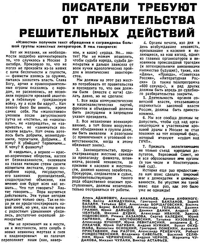 "Pisateli trebuiut ot pravitel’stva reshitel’nykh deistvii [Writers demand decisive actions from the government].” A letter signed by prominent intelligentsia during the 1993 Parliamentary crisis, in which the liberals urge Yeltsin to use lethal force to destroy the Communist-led parliamentary opposition.