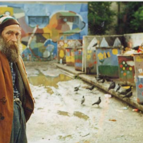 The bearded B.U.Kashkin stands in front of a set of trashbins which have been painted with bright, colorful scenes of trees, butterflies and flowers. Pigeons are digging through the garbage and mud apparent throughout the site.